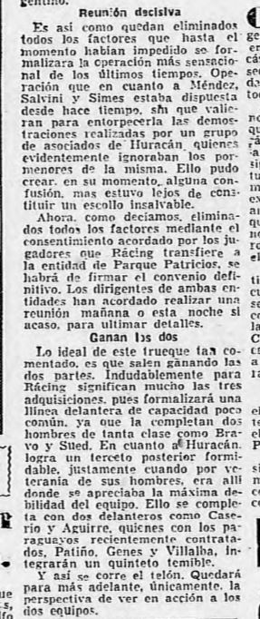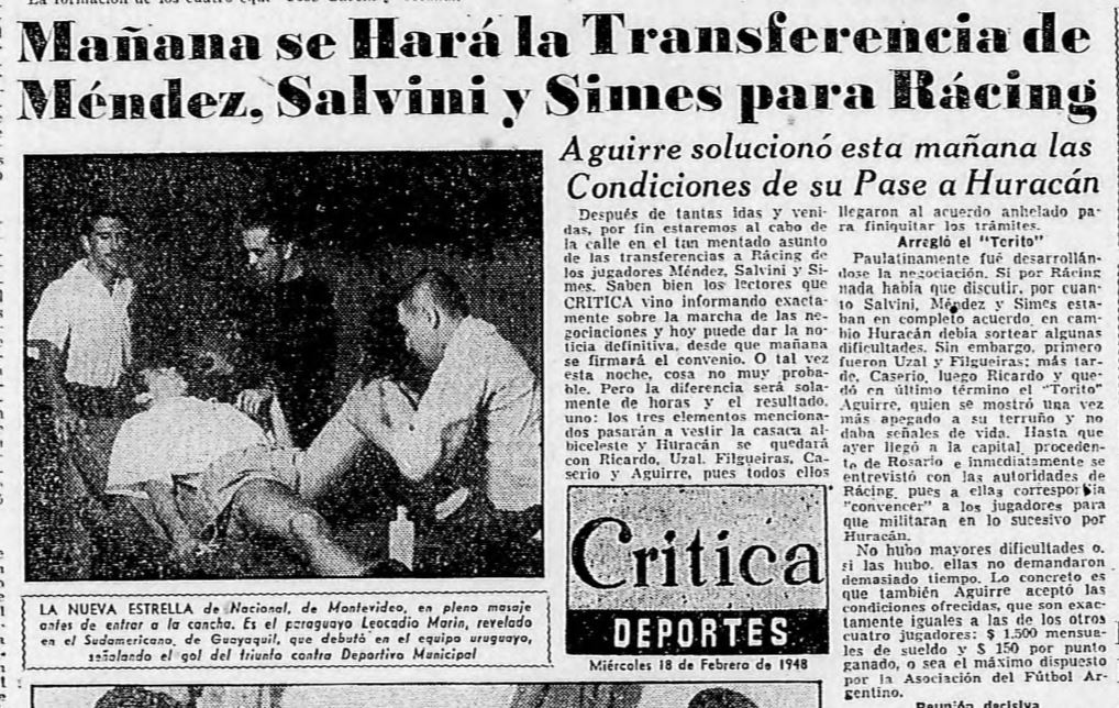 “Paulatinamente fue desarrollándose la negociación. Si por Racing nada había que discutir, por cuanto Salvini, Méndez y Simes estaban en completo acuerdo, en cambio Huracán debía sortear algunas dificultades. Sin embargo primero fueron Uzal y Filgueiras; más tarde Caserio, luego Ricardo y quedó en último término el ‘Torito’ Aguirre”.