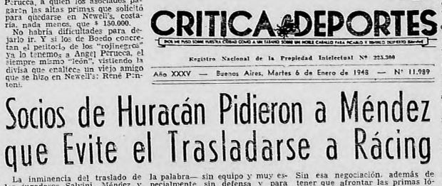 “Racing a Huracán: Méndez, Salvini y Simes a cambio de Caserio, Aguirre, Uzal, Filgueiras, Ricardo y unos cuantos miles de pesos. Los dirigentes están de acuerdo. Faltaba saber que opinaba la asamblea de Huracán. Acaso a estas horas ya se haya producido el trueque de camisetas…”