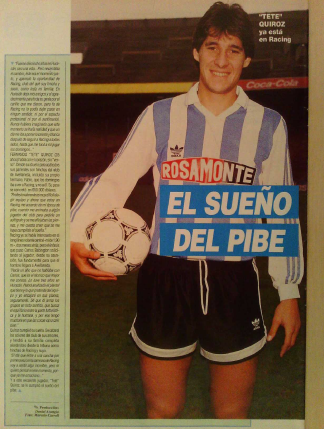 “Me volvía más loco de lo que soy por ponerme de una buena vez esta camiseta. Era la cuarta vez que Racing se interesaba en mi, tenía los colores celeste y blanco entre ceja y ceja. Independiente también me pretendía, pero a pesar de mi amistad con Marchetta preferí a Racing por ese amor platónico que había entre el club y yo, y por eso hice pesar mi opinión en la transferencia. Estos colores me quedan como pintados, es más: quiero morirme en Racing y que me entierren abajo de la tribuna local”