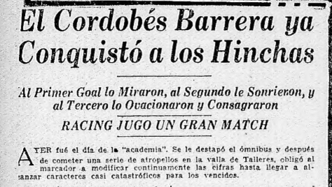 Una semana más tarde, por la cuarta jornada, la Academia volvió a jugar en su estadio. Esta vez pudo festejar y gritar muchos goles, aplastó a Talleres de Remedios de Escalada por 6 a 0 con una gran actuación del “Omnibus” Barrera que metió tres y completaron Vicente del Giúdice, Natalio Perinetti, y Alberto Fassora. Fue el primer triplete de los nueve que consiguió Barrera en Racing.