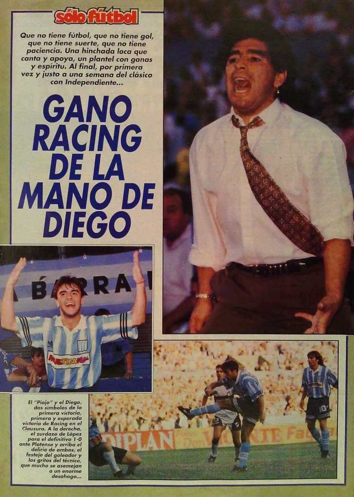 1995- Clausura. Fecha 2. Racing 1-0 Platense. Gol de Claudio López. Primer triunfo de Diego Maradona como DT de Racing.