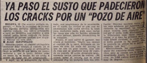 1967- El avión que llevaba a Racing de Medellín a Bogotá casi se cae. El Equipo de José había derrotado a DIM dos días antes, y el 29 jugaba contra Independiente en Bogotá. Horas de terror en las que temieron lo peor, pero por suerte pudieron aterrizar, ganaron su partido y luego ganaron la copa.