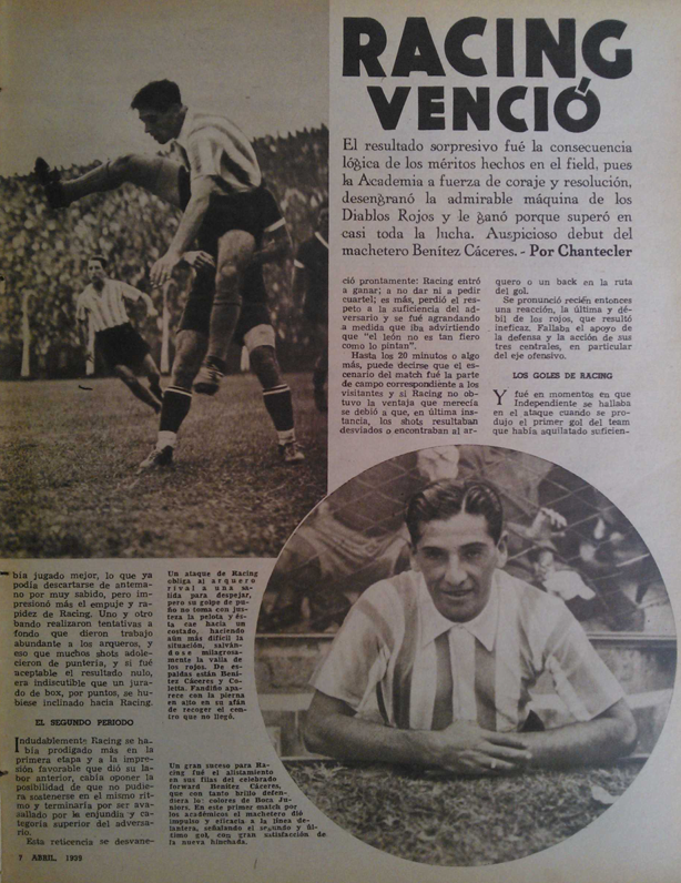 1939- PD. Fecha 3. Racing 2-0 Independiente. Debut de Delfín Benítez Cáceres en Racing, marcó el 2-0 a los 73′ y asistió a Enrique García en el primer gol.