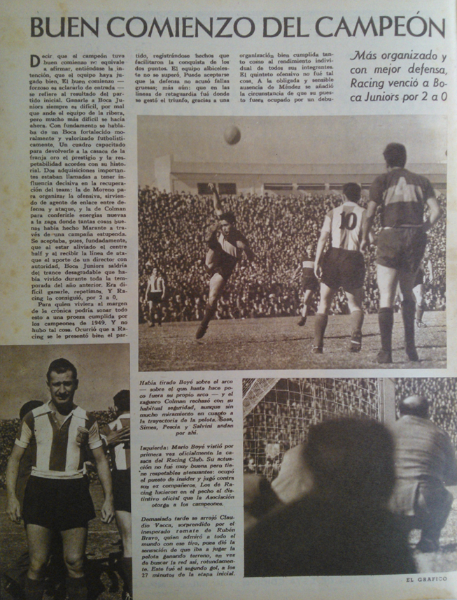 1950- PD. Fecha 1. Racing 2-0 Boca. Debut de Mario Boyé en Racing y José Manuel Moreno en Boca, solo pudo jugar un tiempo y se retiró lesionado. Los goles fueron de Juan Salvini y Rubén Bravo.